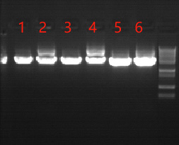 挑取單斑下提取質粒圖:1-6分別為7h的DH5α,7h的K1,8h的DH5α,8h的K1,過夜的含氨芐抗性質粒的DH5α,K1。