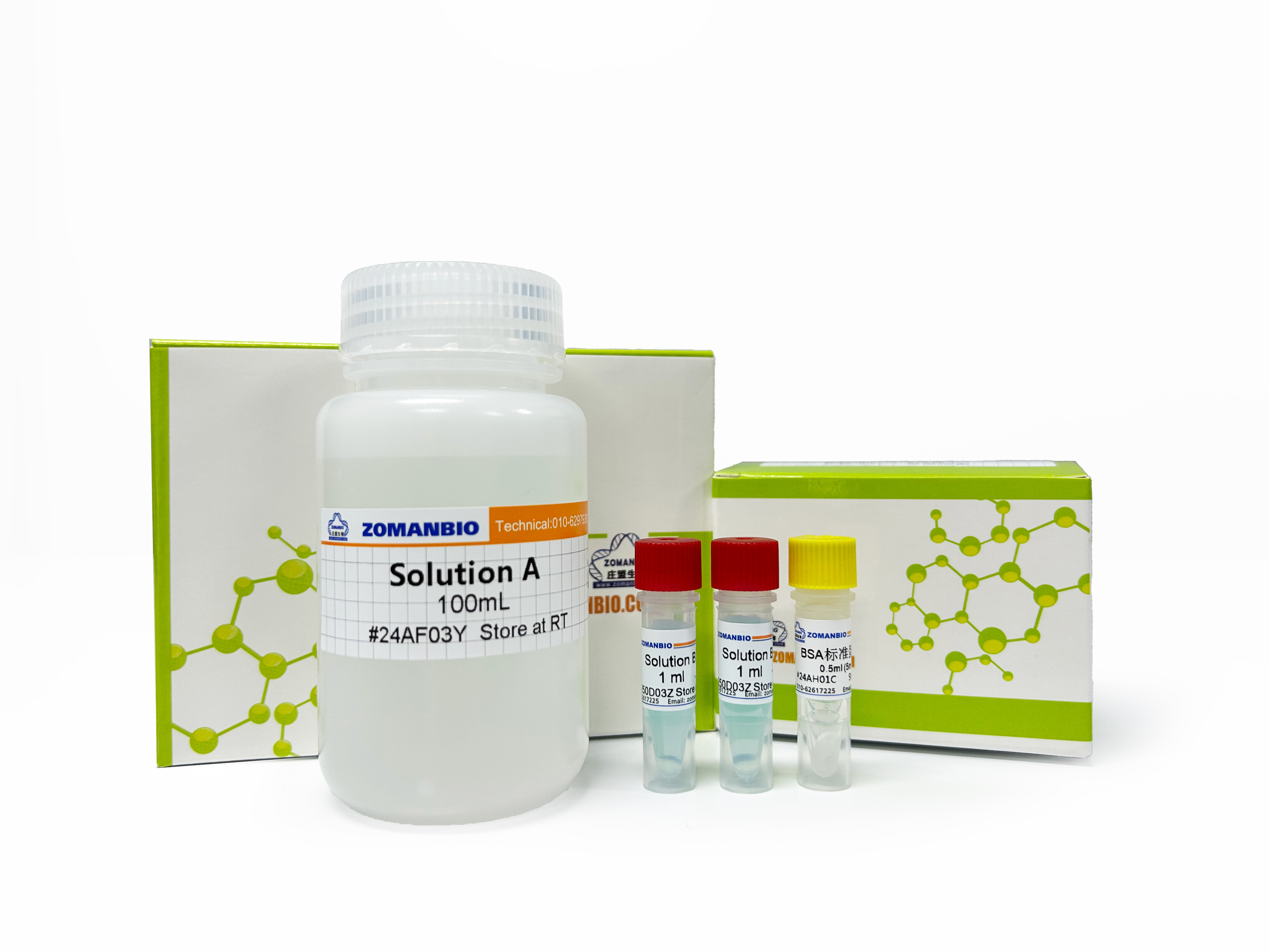 BCA(bicinchoninic acid)法蛋白濃度定量試劑盒是一種抗干擾能力強且準確定量的蛋白含量檢測試劑盒。眾所周知,二價銅離子在堿性的條件下,可以被蛋白質還原成一價銅離子(biuret reaction),一價銅離子和獨特的 BCA Solution A(含有 BCA)相互作用產生敏感的顏色反應。兩分子的 BCA 螯合一個銅離子,形成紫色的反應復合物。該水溶性的復合物在 562nm 處顯示強烈的吸光性,吸光度和蛋白濃度在廣泛范圍內有良好的線性關系,因此根據吸光值可以推算出蛋白濃度。