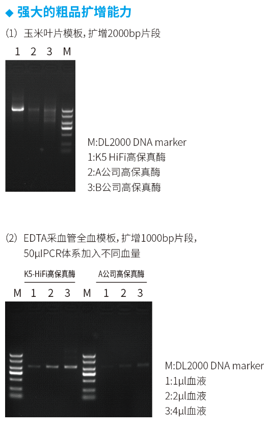 K5 HiFi DNA Polymerase是基于Pfu DNA Polymerase改造而成的“超保真快速DNA聚合酶”,具有極高的擴增效率和廣泛的模板適應(yīng)性。K5 HiFi DNA Polymerase保真度是普通Taq酶的81倍,擴增速度可以達(dá)到15秒/kb。 使用λDNA、質(zhì)粒等簡單模板,可有效擴增長達(dá)40 kb的片段;使用基因組DNA等復(fù)雜模板,可擴增長達(dá)20 kb的片段;使用cDNA模板,可有效增長達(dá)10 kb的片段,即使是復(fù)雜模板,高GC模板,也能準(zhǔn)確快速的完成反應(yīng)。此外,對PCR抑制劑有良好的抵抗能力,可用于細(xì)菌、真菌、植物組織、動物組織或全血樣品的直接PCR。使用該產(chǎn)品得到的PCR擴增產(chǎn)物為平末端,不可以直接用于TA克隆。