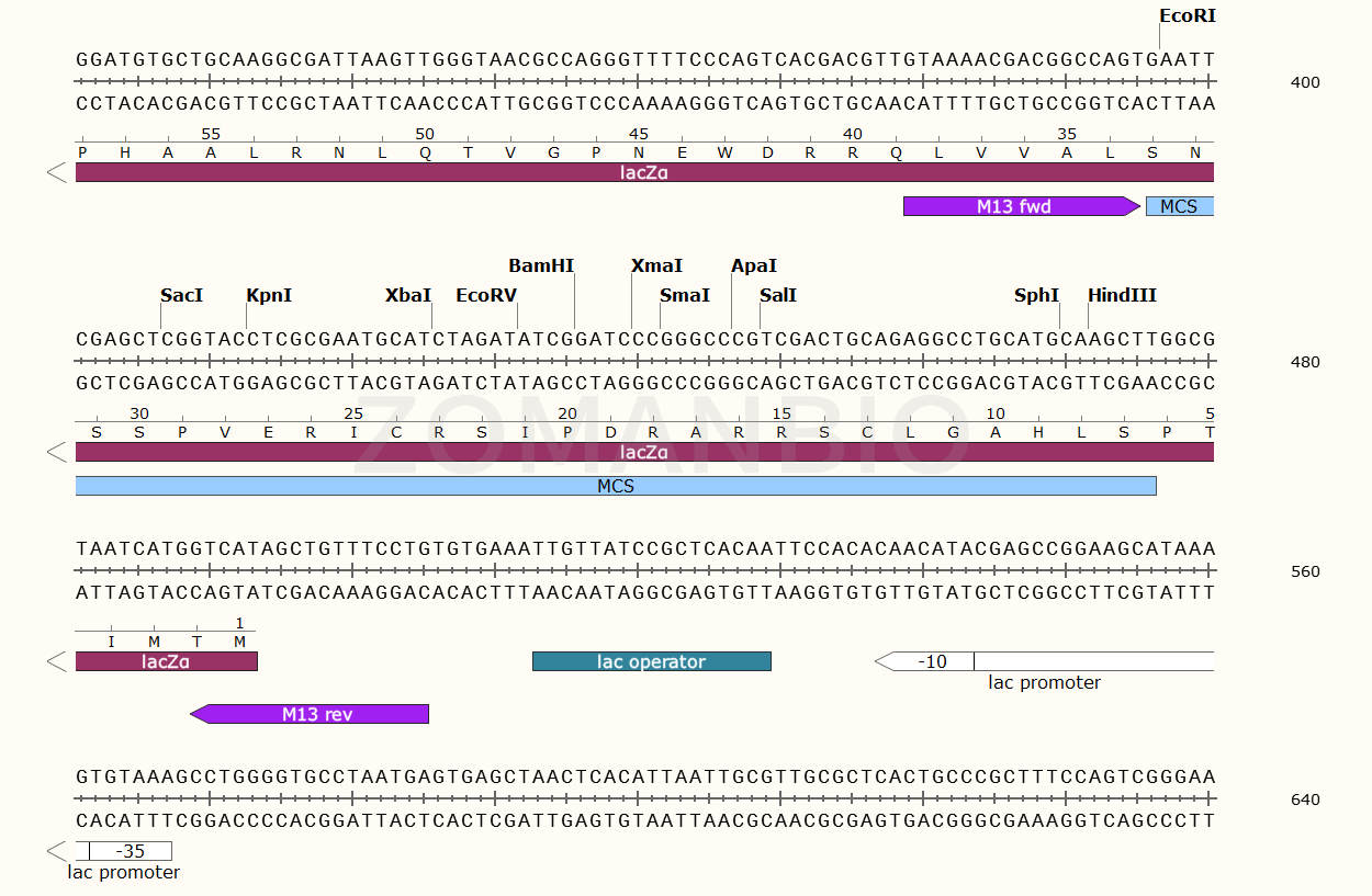 pUC57是大腸桿菌克隆質粒,大小為2710bp,含有氨芐抗生素抗性基因,能在含有氨芐的LB培養基上生長,是一個高拷貝質粒載體,可用于藍白斑篩選。質粒只保證關鍵序列正確,不保證表達效果。
