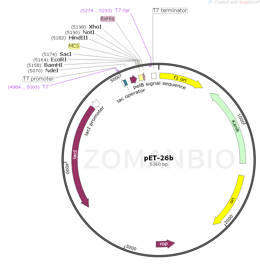 pET-26b質(zhì)粒是一種原核表達(dá)載體,C端含有一個6×His標(biāo)簽,N端含有一個pelB前導(dǎo)肽。該質(zhì)粒含有多個常用的酶切位點,便于不同基因克隆。表達(dá)由宿主細(xì)胞提供的T7 RNA聚合酶誘導(dǎo),目的基因被克隆到質(zhì)粒載體上,受噬菌體強轉(zhuǎn)錄及翻譯信號控制。