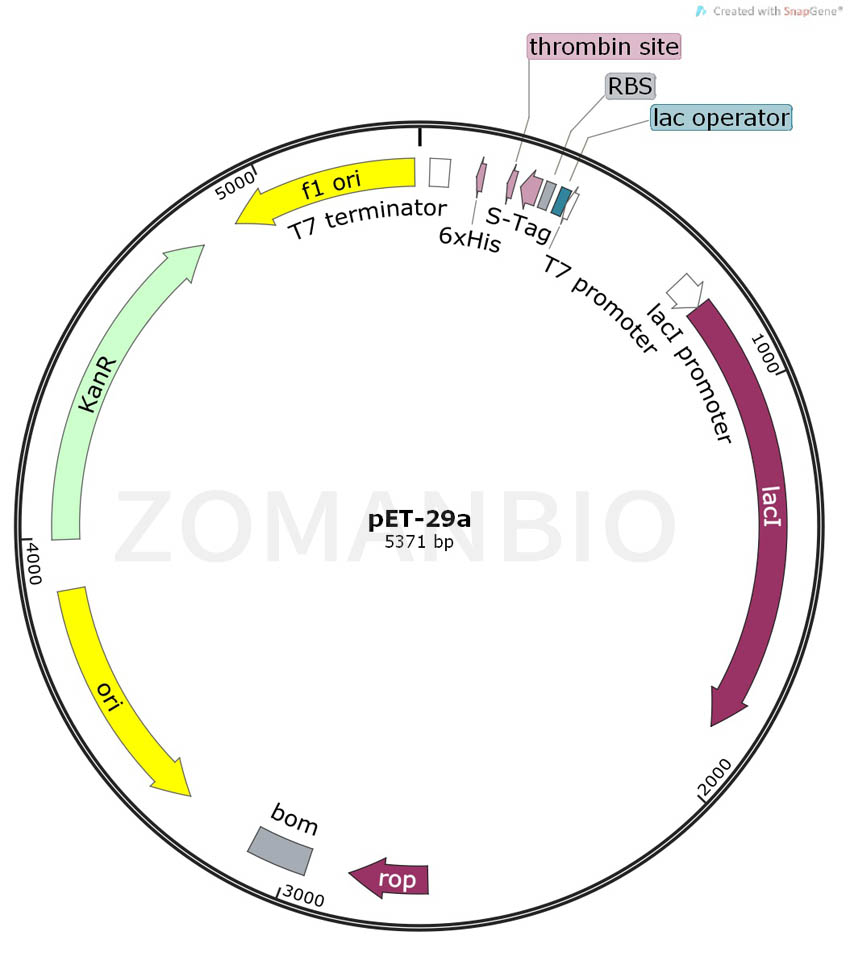 pET-29a質粒是一種原核表達載體,C端含有一個6×His標簽,N端含有一個thrombin位點和S標簽。該質粒含有多個常用的酶切位點,便于不同基因克隆。表達由宿主細胞提供的T7 RNA聚合酶誘導,目的基因被克隆到質粒載體上,受噬菌體強轉錄及翻譯信號控制。