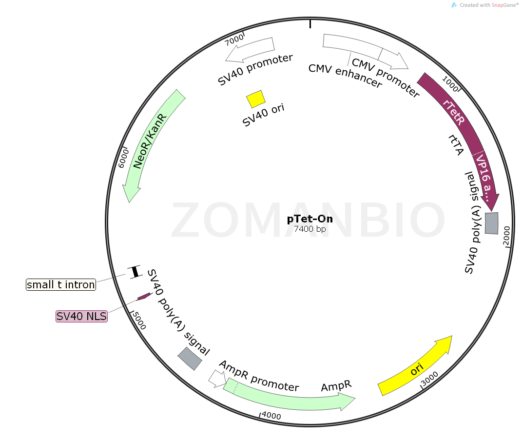 pTet-On? expresses the reverse tet-responsive transcriptional activator (rtTA) from the strong immediate early promoter of cytomegalovirus (PCMV). tTA is a fusion of amino acids 1–207 of the tet repressor (TetR) and the negatively charged C-terminal activation domain (130 amino acids) of the VP16 protein of herpes simplex virus. pTet-On is similar to pTet-Off except for four amino acid changes that convert the TetR to a rTetR, and consequently, tTA to rtTA. (pTet-Off also contains several silent mutations.) pTet-On was originally described as pUHD17-1neo by Gossen et al. (1995). pTet-On can be distinguished from pTet-Off by digestion with Hind III.