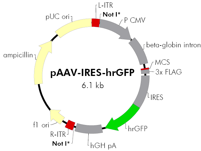 該質粒pAAV-IRES-hrGFP載體含有在哺乳動物細胞中基因的高水平表達的CMV啟動子和其他元素時。該載體還包含構建反向末端重復序列(ITRS),其中直接病毒復制和包裝。質粒pAAV-IRES-hrGFP可容納插入≤1.7 KB。