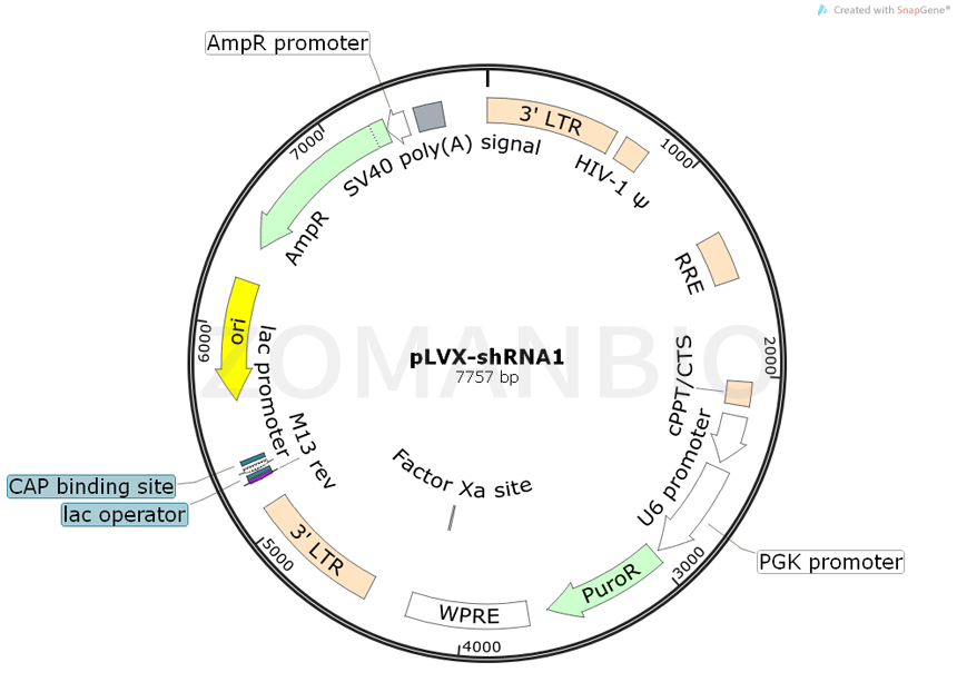 pLVX-shRNA1 is an HIV-1-based, lentiviral expression vector designed to express a small hair-pin RNA (shRNA) for RNA interference (RNAi) studies. Expression of your shRNA is drivenby the RNA Pol III-dependent, human U6 promoter (PU6), located just upstream of the MCS. pLVX-shRNA1 can either be used as a plasmid expression vector and transfected into cells, or it can be packaged into viral particles and transduced into cells. Lentiviral particles derived from the vector allow the expression of shRNAs in virtually any cell type, including primary cells.