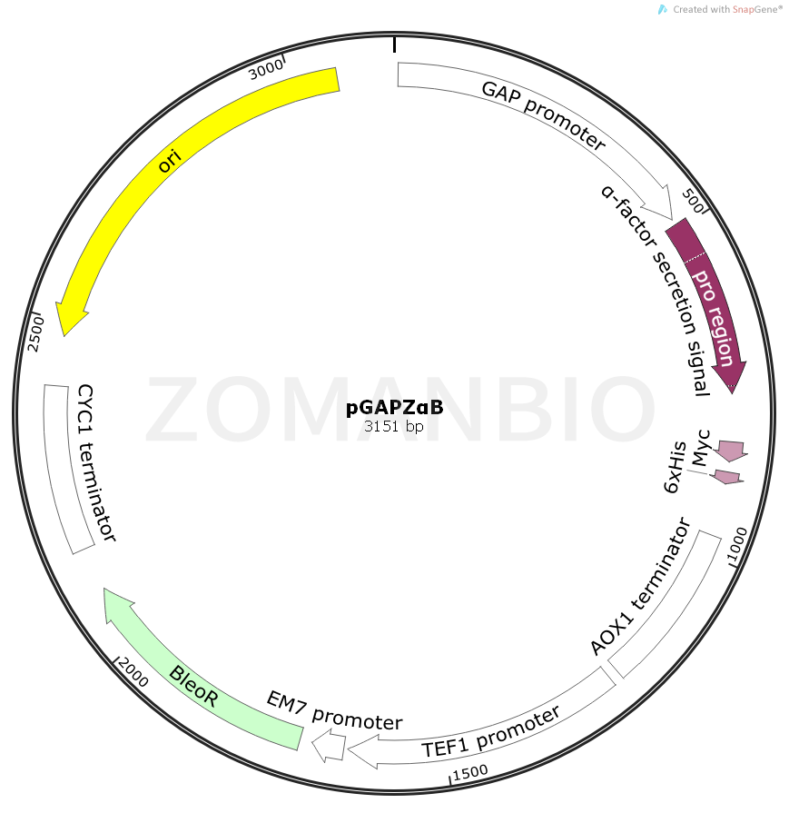 pGAPZ A,B,和C載體(2.9 KB)和pGAPZαB和C(3.1 KB)載體使用GAP啟動子在畢赤酵母中穩定表達重組蛋白。重組蛋白表達為為帶有C-末端myc抗原表位和C端His標簽的融合蛋白。此外,pGAPZα 表達的融合蛋白在N-端帶有釀酒酵母(Saccharomyces cerevisiae)的α-因子分泌信號肽。這兩個系列的載體都提供三個不同讀碼框的載體,以方便克隆的帶有C-端標簽和/或N-末端分泌信號肽的載體中。