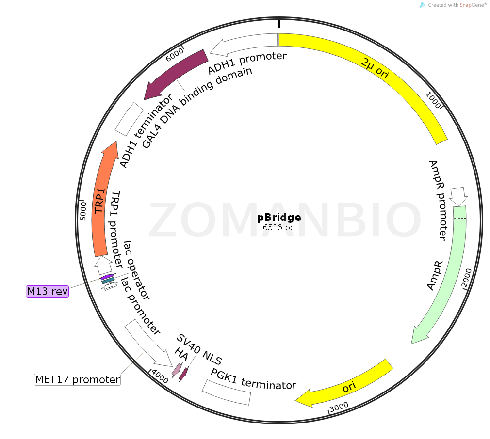 pBridge is a shuttle vector that replicates autonomously in both E. coli and S. cerevisiae. It carries the bla gene (for ampicillin resistance in E. coli) and the TRP1 nutritional marker that allow yeast auxotrophs carrying pBridge to grow on limiting synthetic medium lacking tryptophan. Note: Yeast strain Y187 is a methionine auxotroph; therefore, haploid Y187 harboring pBridge cannot be grown on medium lacking methionine.